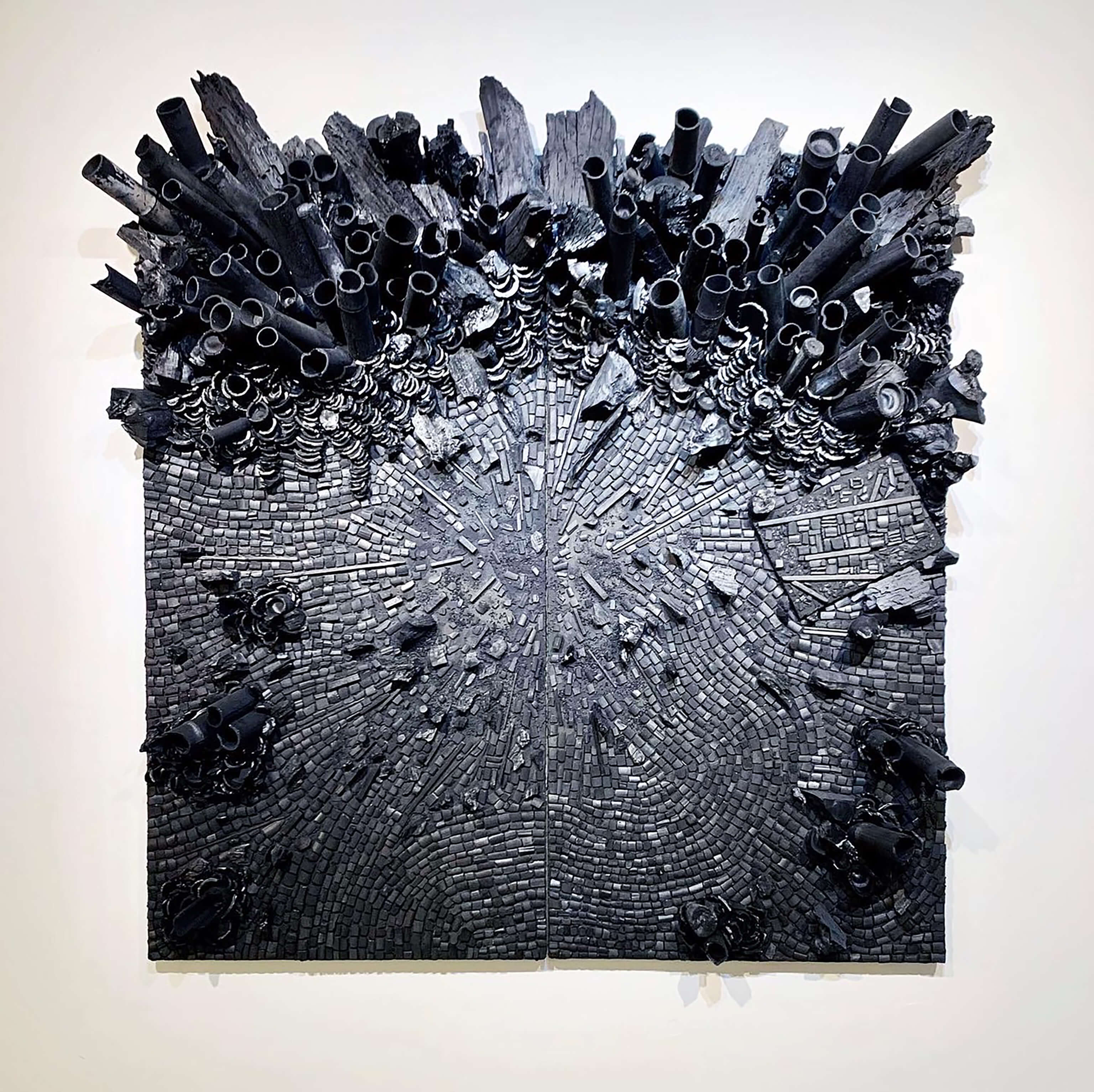 • 黃敬中 則以炭材作為核心,透過火煉的過程紀錄生命的循環。在炭化與拼貼的痕跡裡,他探索著都市與自然間的秩序,將殘留的痕跡轉化為重生的力量,讓回憶在餘燼中閃耀。